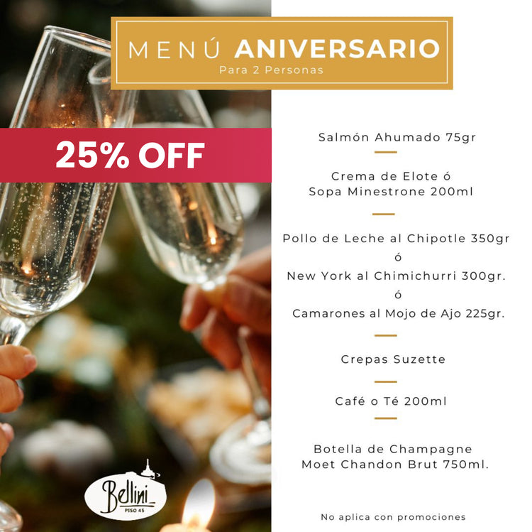 El menú de parejas perfecto para gozar de una exquisita tarde acompañada de un un menú de 4 tiempos, una botella de Moet Chandon Brut 750 ml. y la mejor vista de la ciudad en el único restaurante giratorio en México ubicado en el WTC.